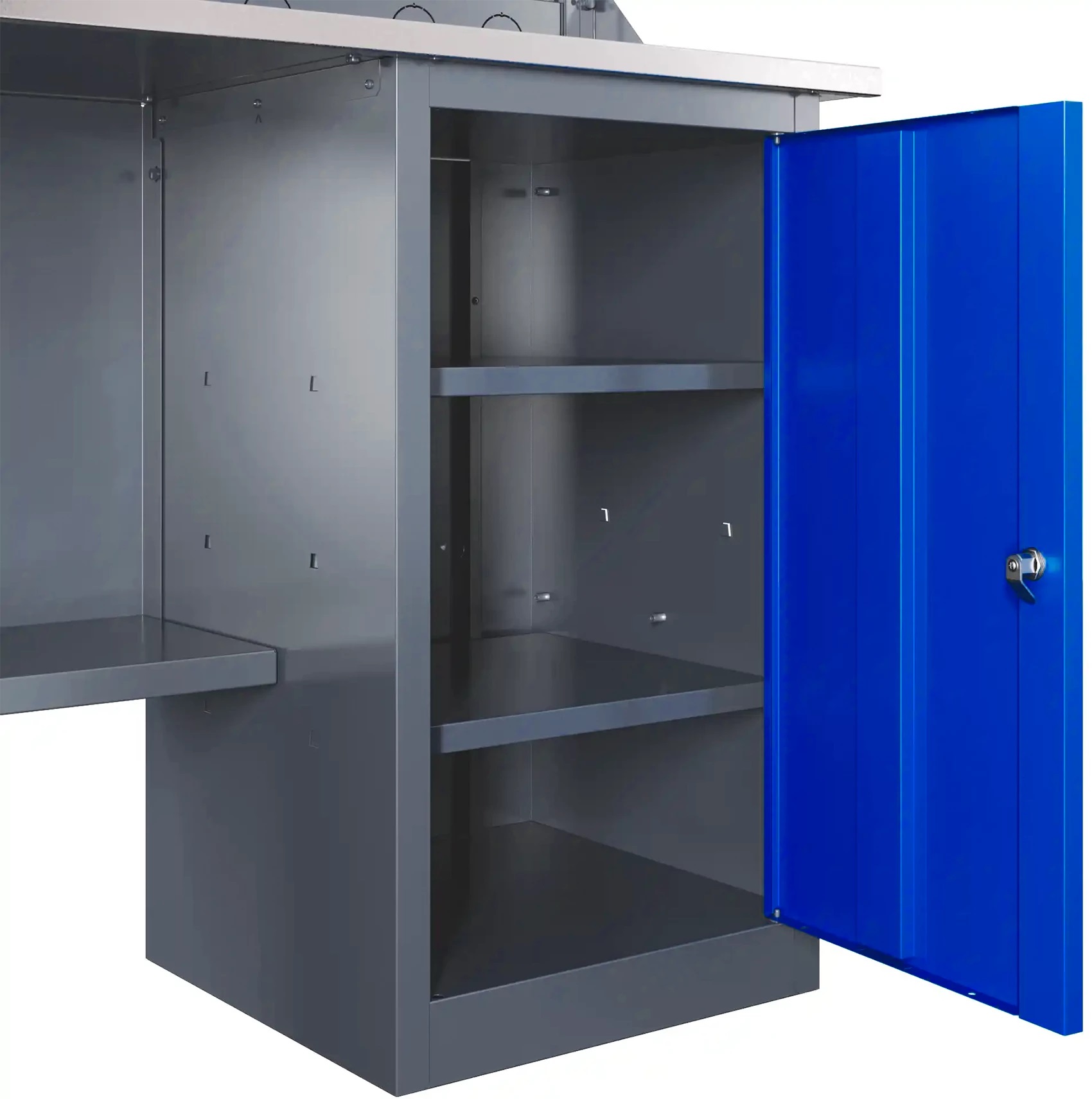 - Элегантное сочетание пыльно-серого и небесно-синего цветов придаёт верстаку привлекательный вид – это весьма существенно при установке в домашней мастерской или учебном заведении.